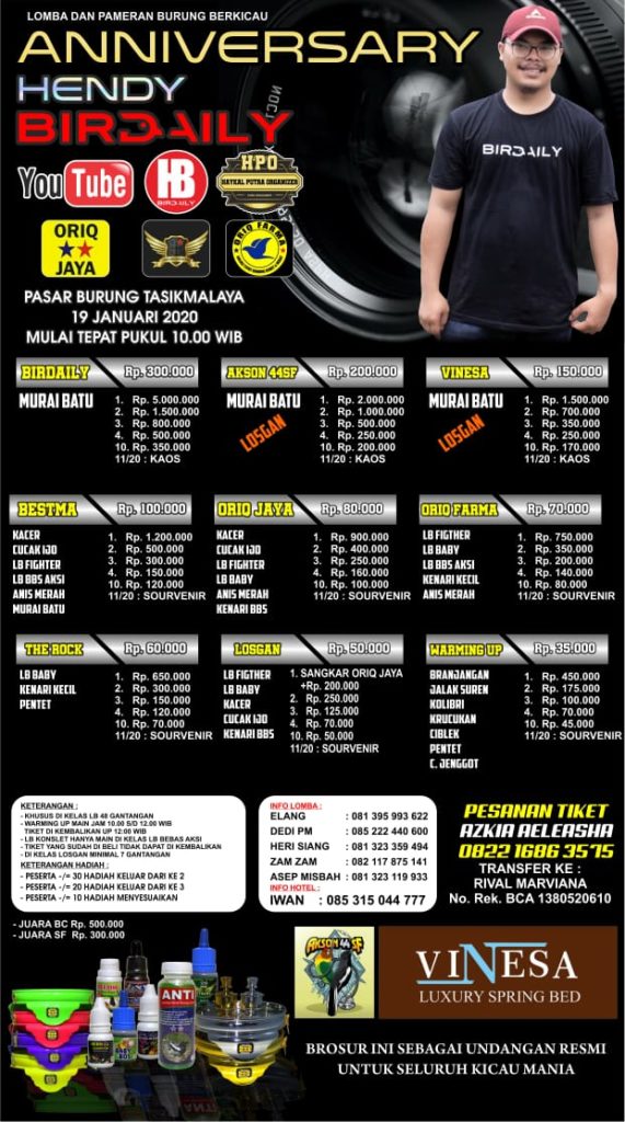 Birdaily.com – Lomba dan pameran burung berkicau dengan tema Anniversary Hendy Birdaily bersama Oriq Jaya terbilang sukses digelar pada Minggu (19/01) dan Pasar Burung Tasikmalaya menjadi tempat yang dipilih oleh sang penggagas yaitu Hendy Birdaily.