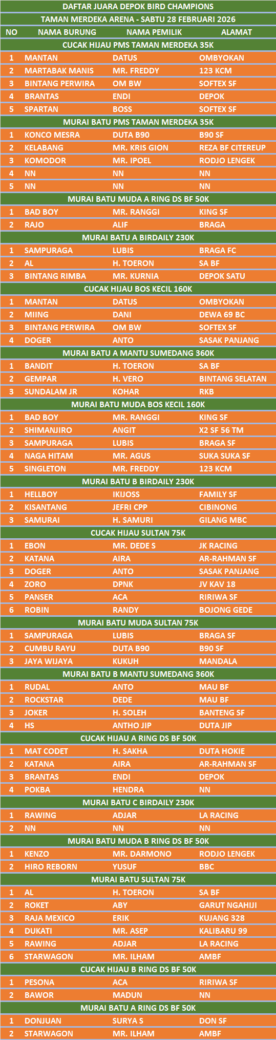 DAFTAR JUARA DEPOK BIRD CHAMPIONS – TAMAN MERDEKA ARENA – SABTU 28 FEBRUARI 202628 February 20260Share Tags:burung berkicauDunia burungDunia KicauHobi BurungJadwal LombaKicau Burungkicau maniaLomba BurungMURAI BATUthe authorAwal SaputraLeave a reply Leave a Reply Cancel replyWrite your comment hereName Email Website