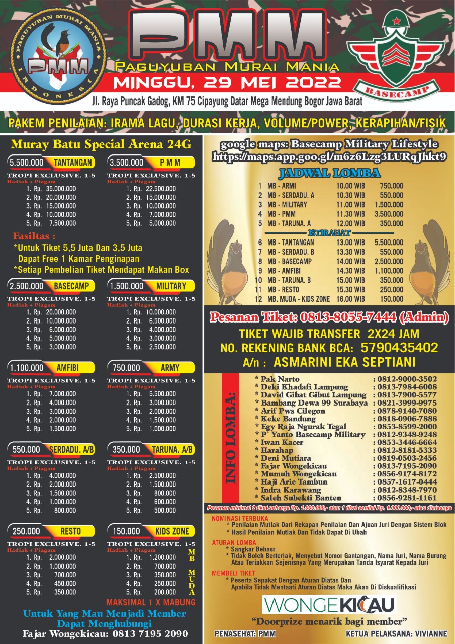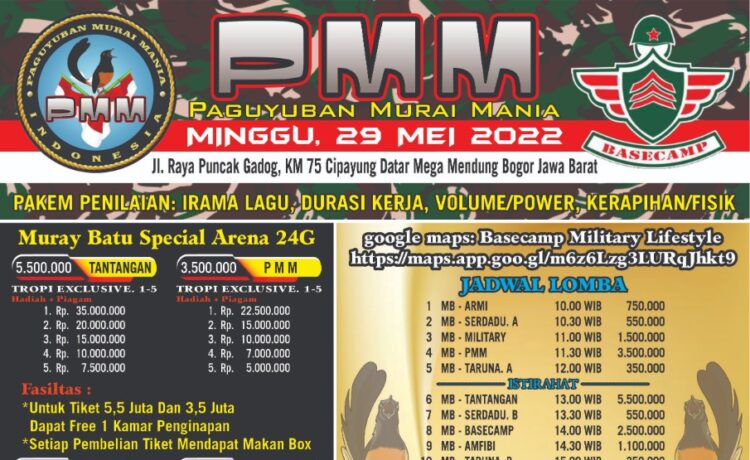 Dan pada hari Minggu 29 Mei 2022, PMM (Paguyuban Murai Mania) mengadakan event spektakulernya yang bertempat di Basecamp Military Lifestyle (Jl. Raya Puncak Gadog, KM 57 Cipayung Datar Mega Mendung Bogor Jawa Barat. Mari kita sukseskan gelaran kali ini dan jangan sampai kehabisan tiketnya. Perhatikan brosurnya secara detail yaa!!