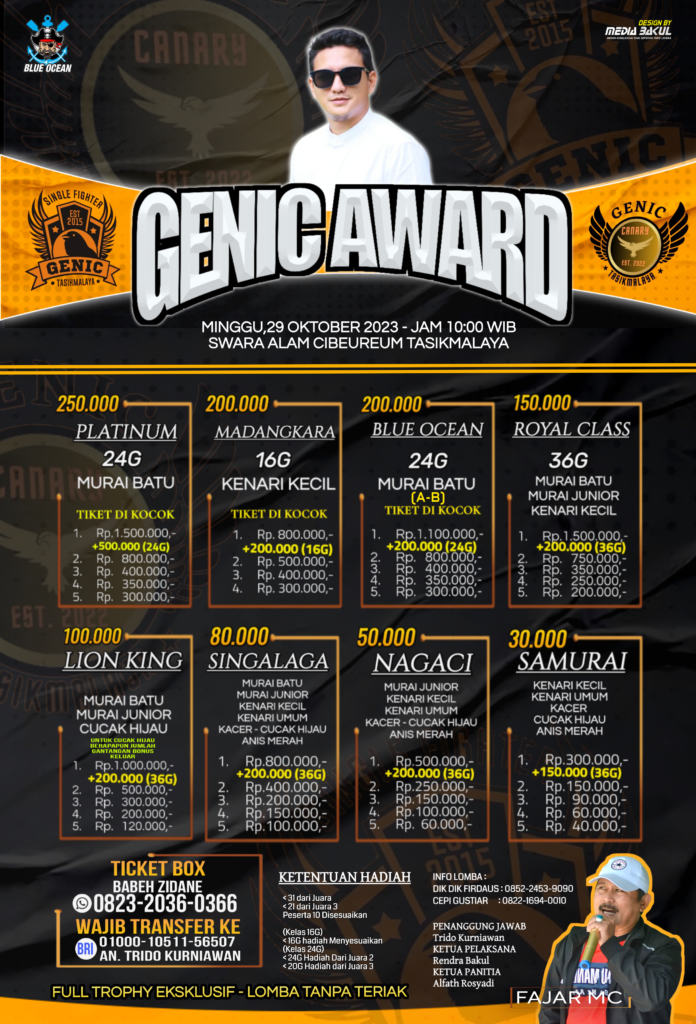 Capaian tersebut membuat Mr. Trido semakin bersemangat dan bergairah untuk menggelanggang acaranya dengan tajuk Genic Award yang mana tidak lama lagi akan gelar di Tasikmalaya bersama Blue Ocean Indonesia. Acara ini digadang-gadang akan menjadi ajang bertarungnya para jawara Nasional terutama dikelas Murai Batu dan Kenari.