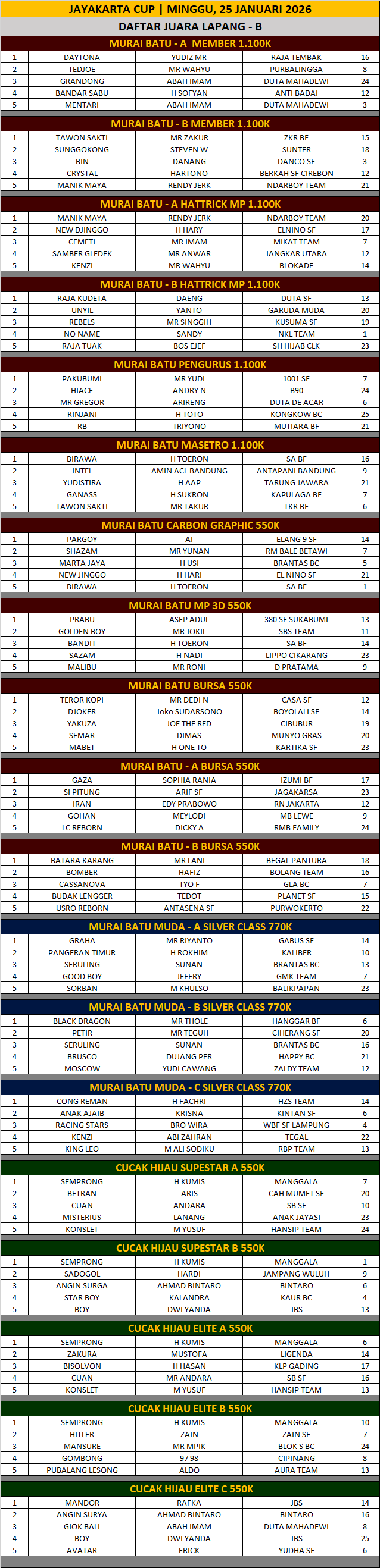 DAFTAR JUARA JAYAKARATA CUP 2026 JUARA LAPANGAN B | MINGGU 25 JANUARI 2026