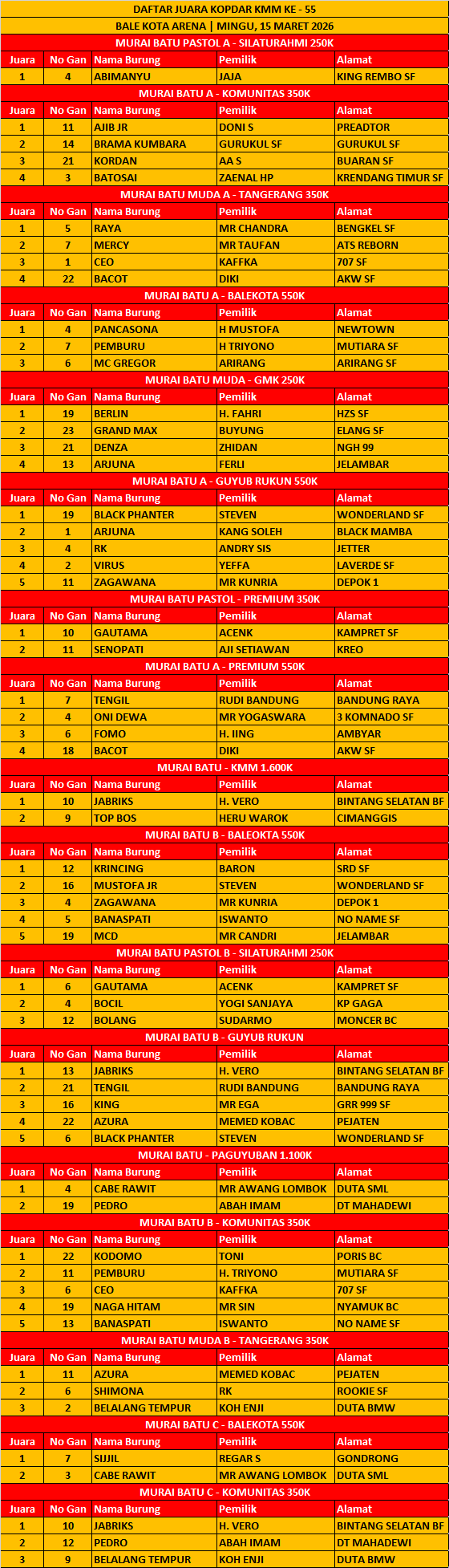 DAFTAR JUARA KOPDAR KMM KE – 55 | BALE KOTA ARENA | MINGGU 15 MARET 202615 March 20260Share Tags:Bird ContestBNR AwardDunia burungDunia KicauHobi BurungJadwal LombaKicau Burungkicau maniaKMMLomba BurungMURAI BATUtangerangthe authorAwal SaputraLeave a reply Leave a Reply Cancel replyWrite your comment hereName Email Website