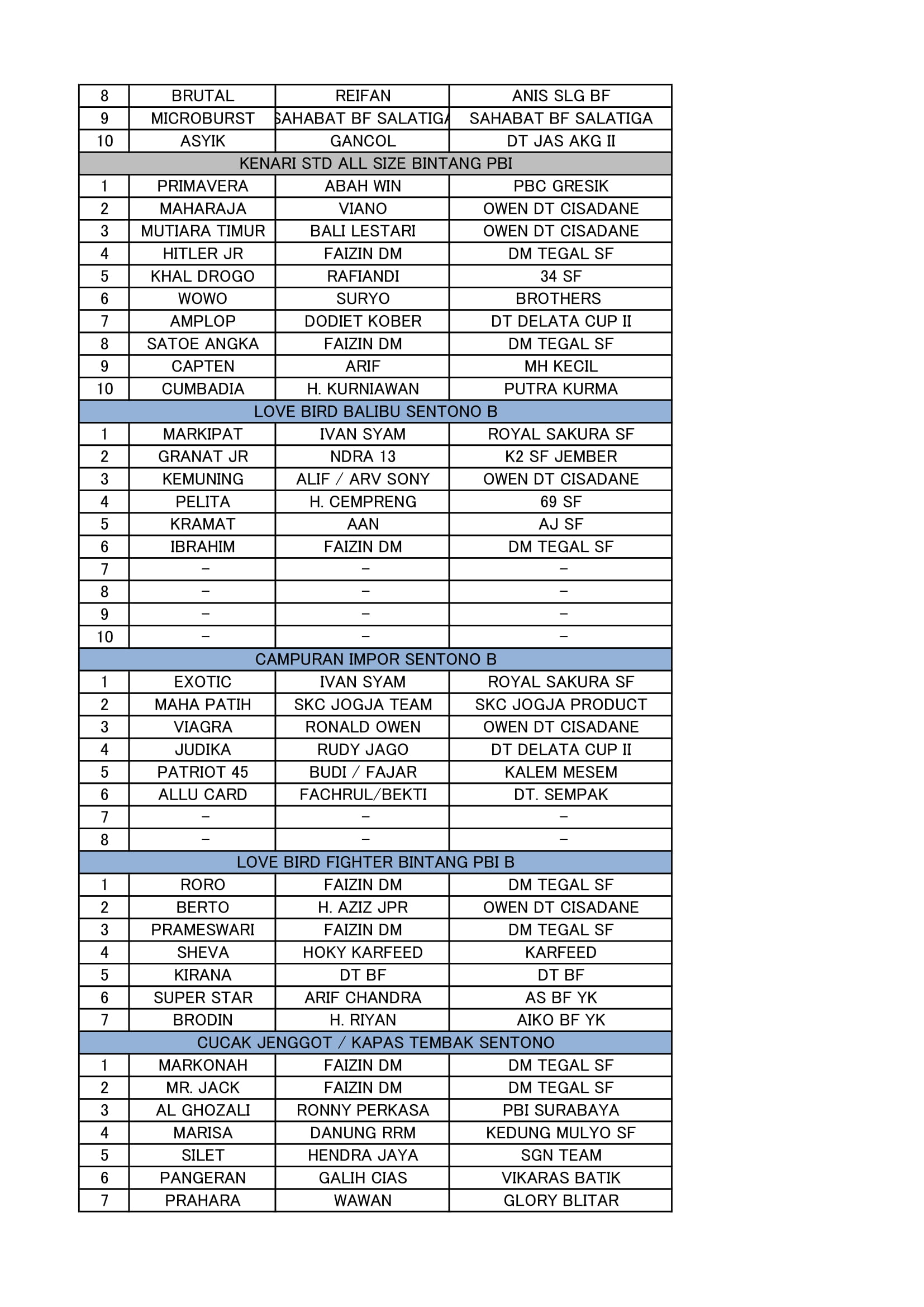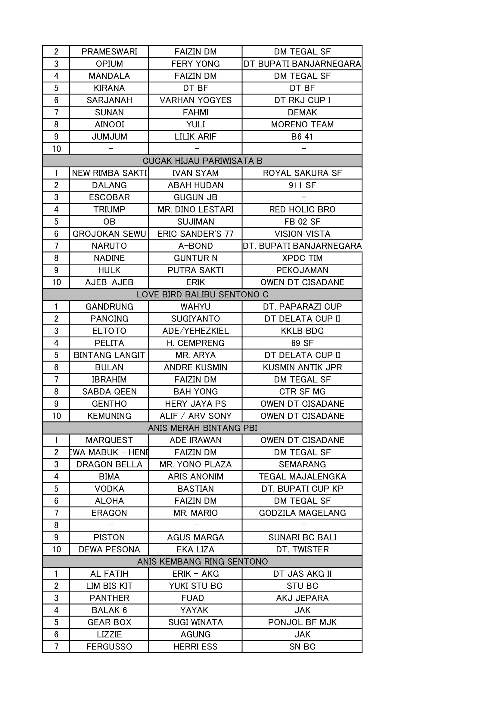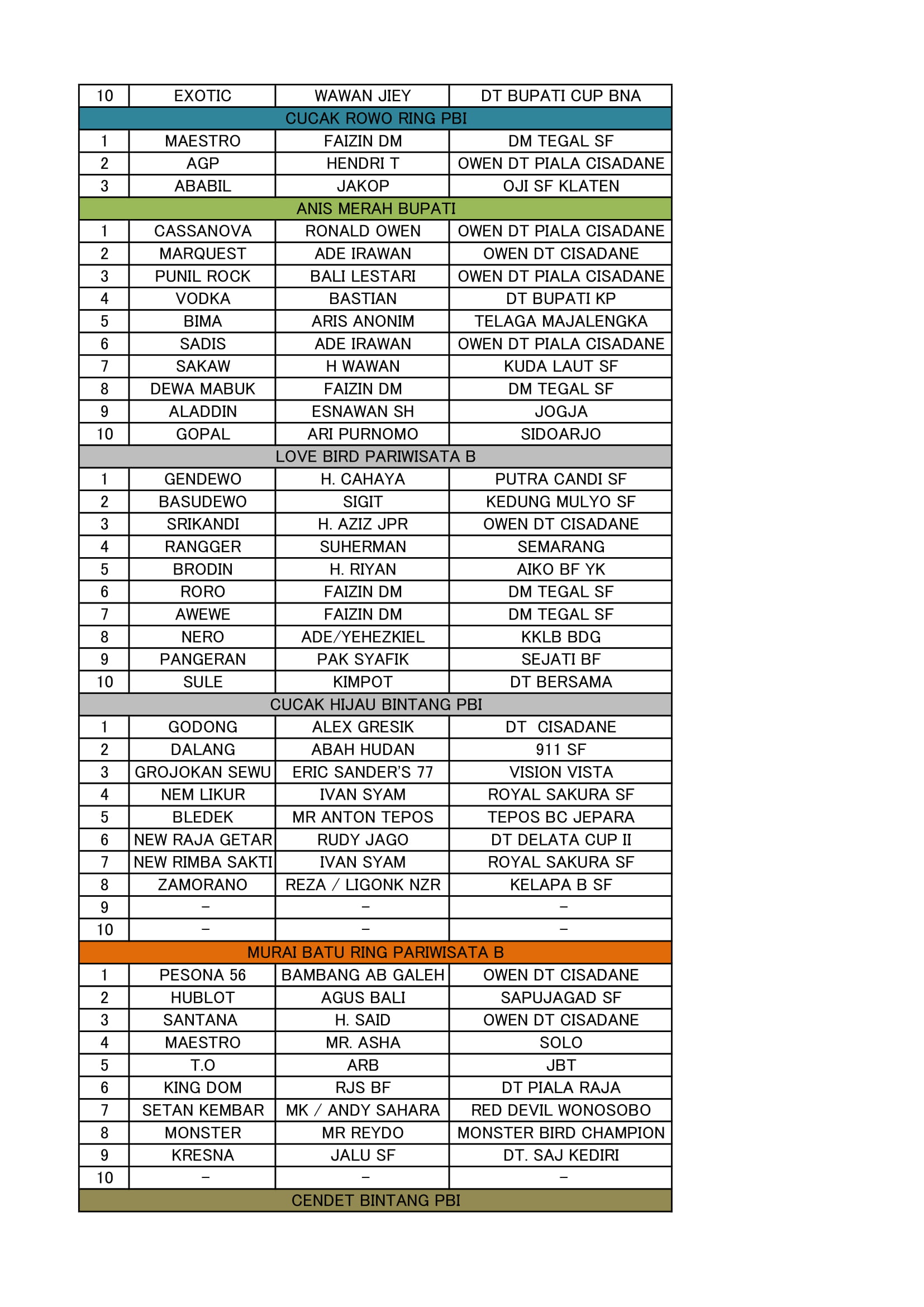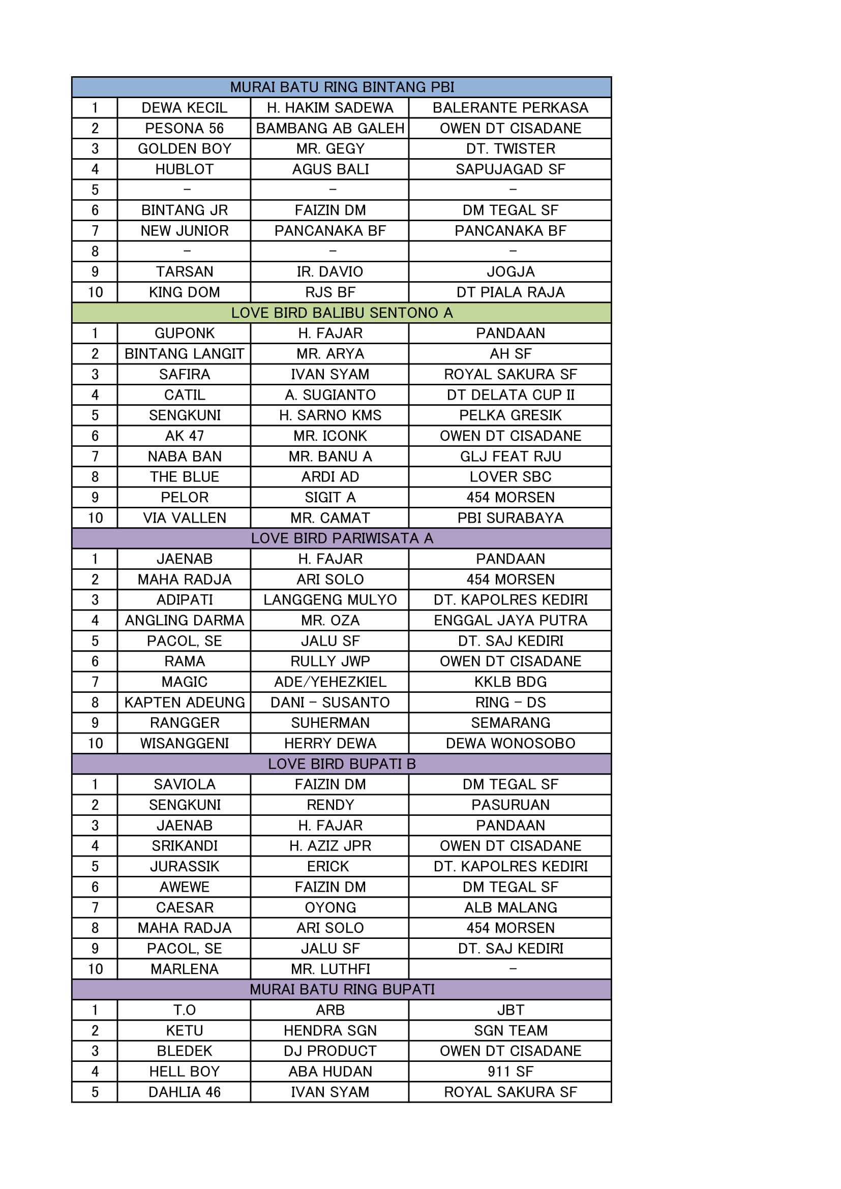 DAFTAR JUARA MURAI BATU BNR BIRD CHAMPIONS 3 – MINGGU, 28 APRIL 2019