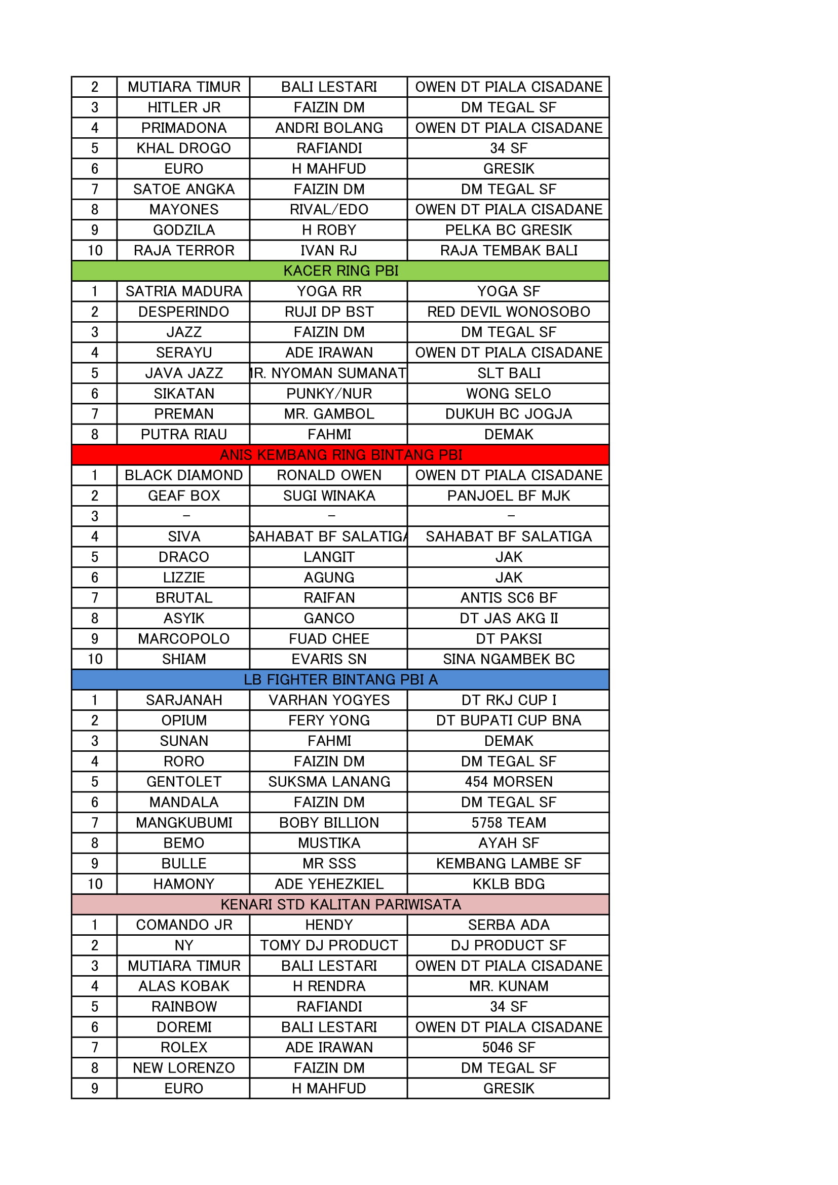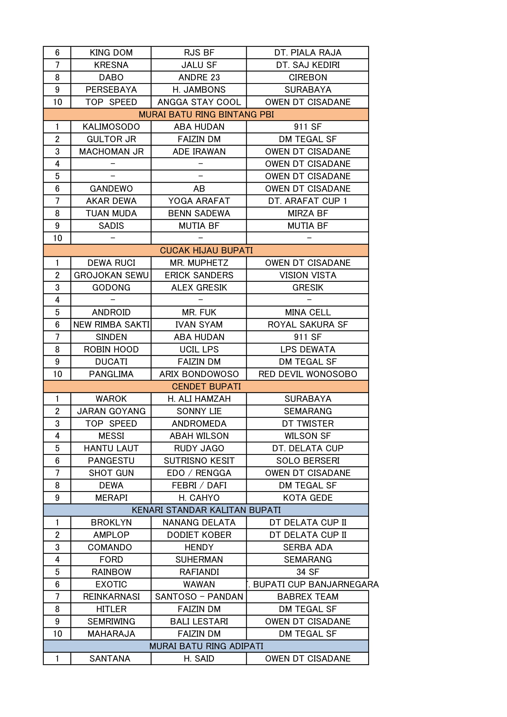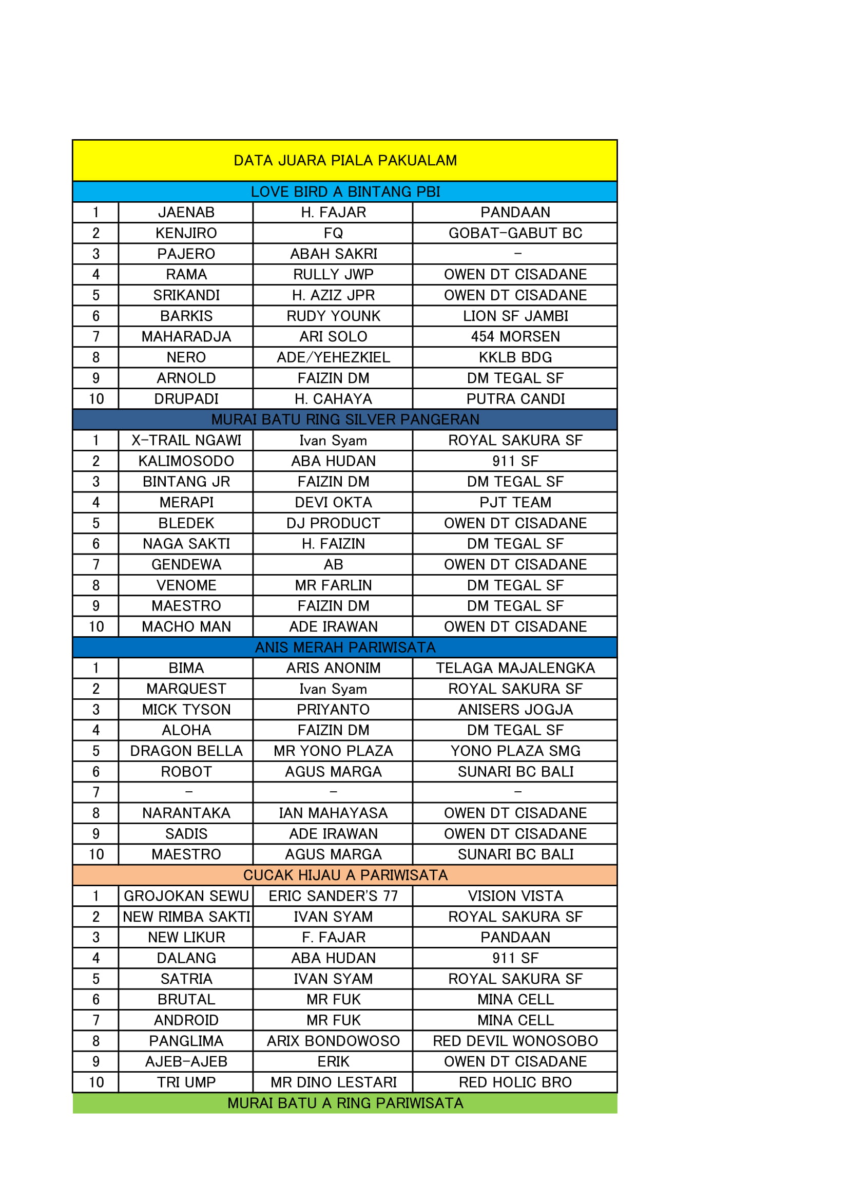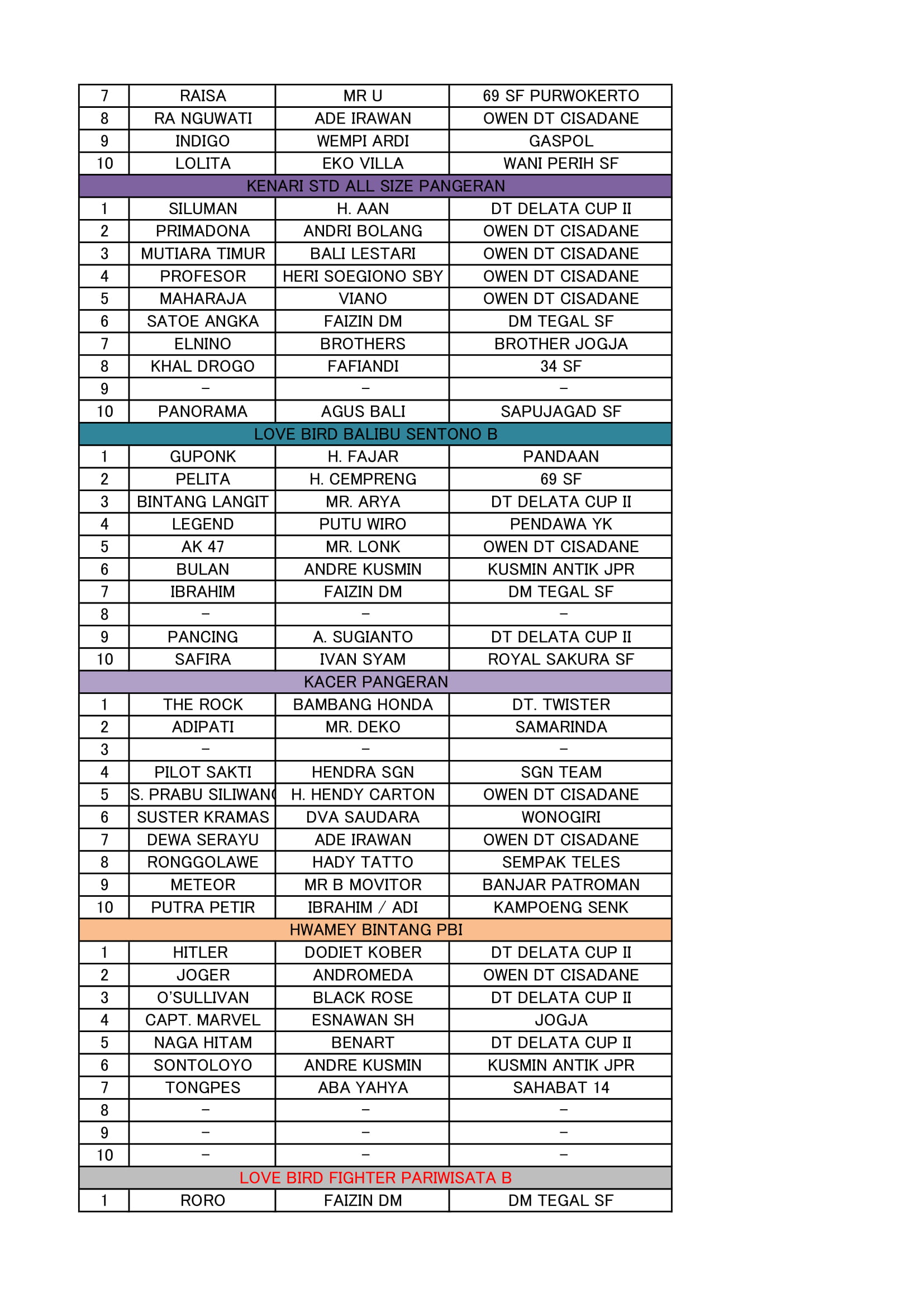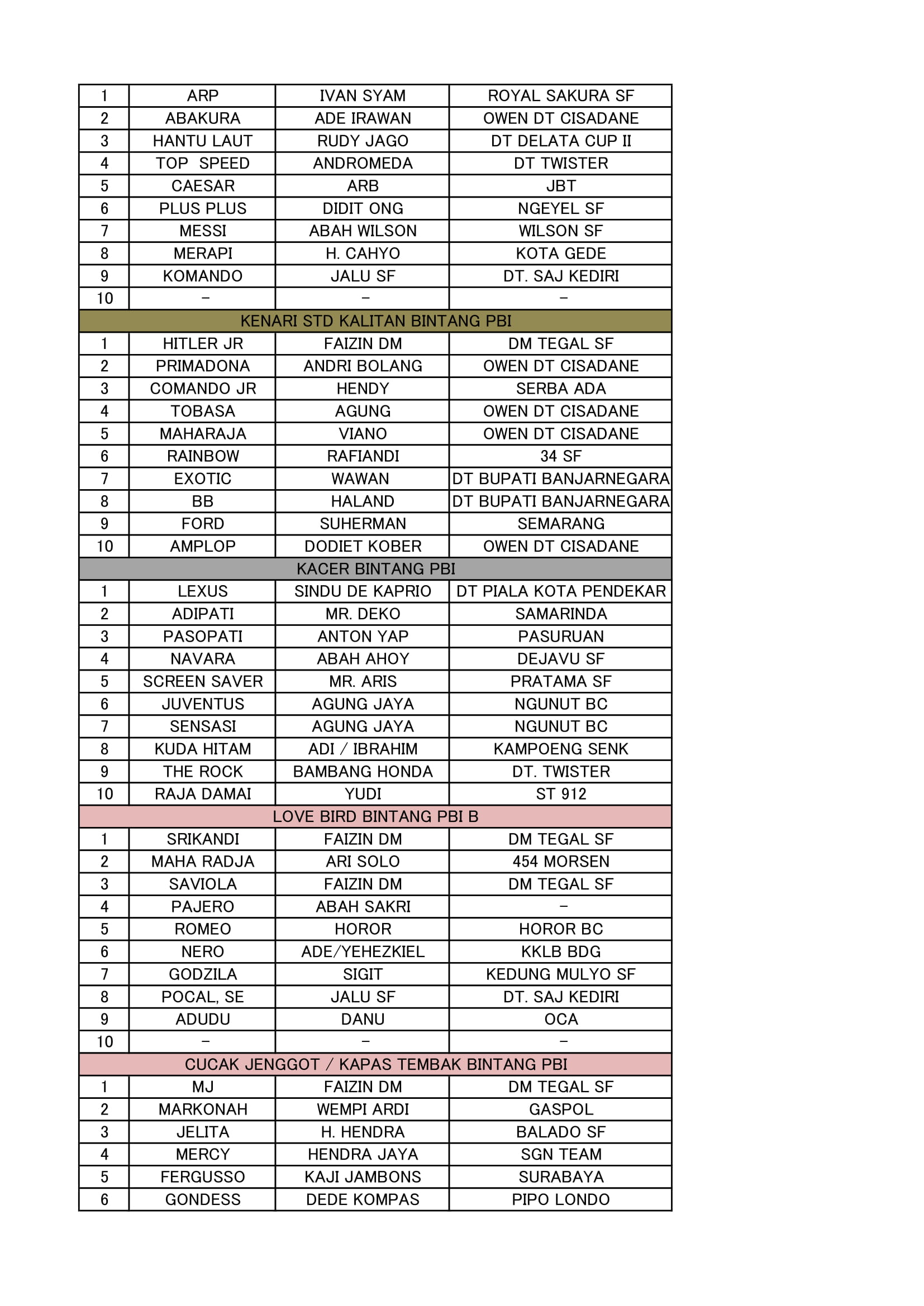 DAFTAR JUARA MURAI BATU BNR BIRD CHAMPIONS 3 – MINGGU, 28 APRIL 2019