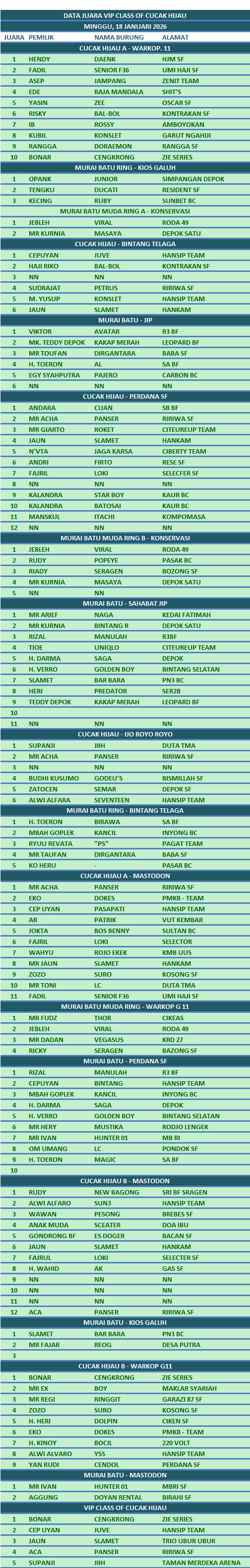 DAFTAR JUARA VIP CLASS OF CUCAK HIJAU | TELAGA ENTERPRISE | MINGGU, 18 JANUARI 202619 January 20260Share Tags:Cucak HijauDunia burungDunia KicauHobi BurungJadwal Lombakicau maniaLomba BurungMURAI BATUthe authorAwal SaputraLeave a reply Leave a Reply Cancel replyWrite your comment hereName Email Website